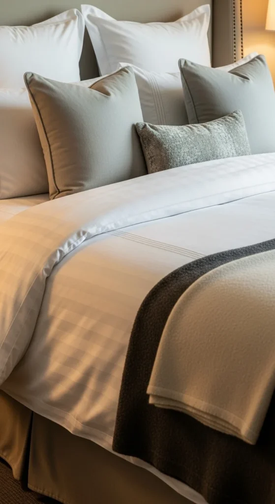 The bed is always the star of a hotel bedroom. It looks inviting because it’s layered thoughtfully, not because it’s complicated.