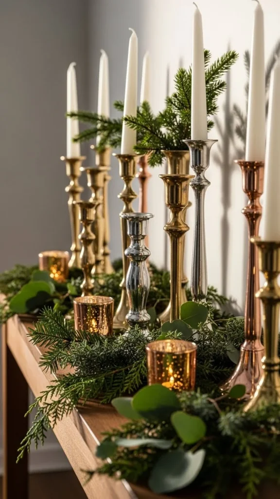 Mixing metal finishes gives a romantic winter look. Collect holders from different sets and blend them into one display. Keep the heights varied. Add a few sprigs of greenery or dried flowers to soften the shine. This setup works well for dining tables, mantels, or entry tables. The mixed-metal glow looks warm and inviting. If you want to save money, spray-paint old holders in metallic shades. Use neutral candles so the metals stay the focus. The mix feels charming and adds character without overwhelming the space.